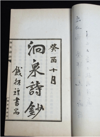 1933年,榮漣仙逝近兩百年后,他旅居海外的族裔榮棣輝,為其輯錄了柯羅版詩集《洞泉詩鈔》。詩集特意請晚清進士、“道德文章馳譽大江南北”的錢振锽題耑。錢振锽(1875~1944),字夢鯨,號名山,江蘇常州人。光緒二十九年進士,官至刑部主事。曾講學寄園垂二十年,道德文章馳譽大江南北。錢振锽先生善書法,晚年喜寫墨竹,清流絕俗。錢先生書法于藝林中甚得推崇,其字以顏字為宗,廣習閣帖,中年后取法倪元璐,黃道周,后來又遍臨漢魏碑,博采兼綜,自成機杼??涤袨橐娖渥?,大為贊嘆“除我之外,當世更無此公匹敵”。其長婿謝玉岑、學生謝稚柳以及張大千、徐悲鴻都極欽服其字。徐悲鴻嘗致書謝玉岑“但求(錢字)精品,多多益善”。于右任、程滄波、謝稚柳談藝,自謂名山先生書法比他好。