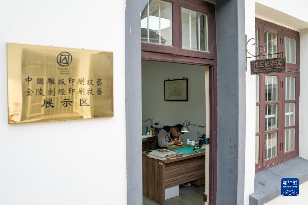 王康在金陵刻經處技藝展示區內鐫刻(4月19日攝)。