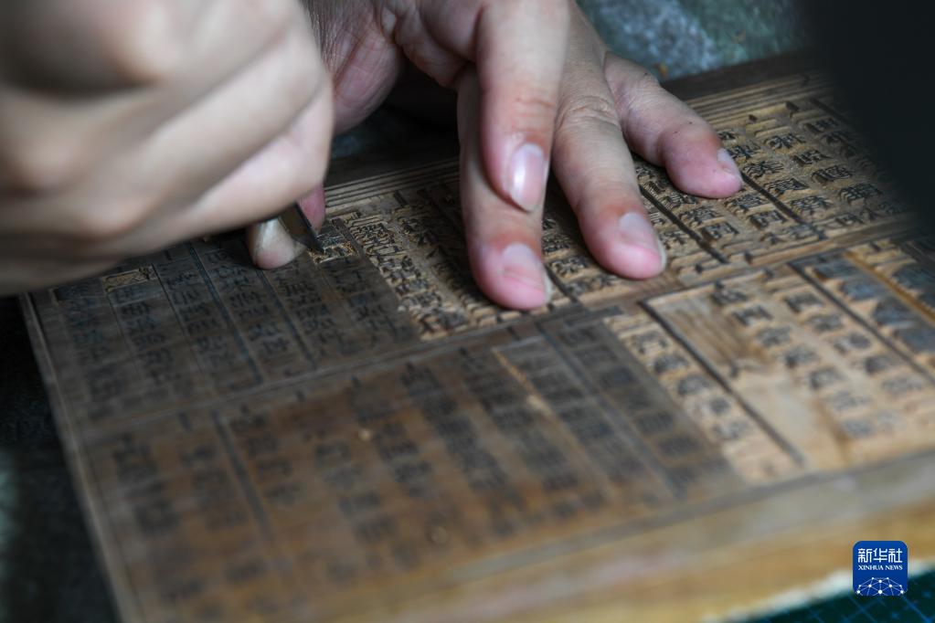 王康在南京金陵刻經處技藝展示區內進行鐫刻(4月15日攝)。