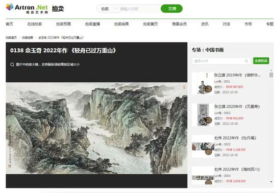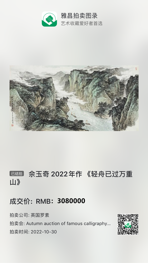 英國羅素拍賣有限公司在2022年10月30日舉行的中國書畫大型拍賣會專場上,此前備受關注的畫家佘玉奇作品《輕舟已過萬重山》經多輪激烈競逐,最后以308萬落槌成交。