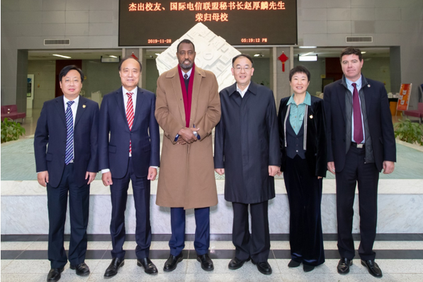 2019年11月28日,國際電信聯盟秘書長趙厚麟,時任萬國郵聯總局長比沙爾·侯賽因,時任國家郵政局黨組書記、局長馬軍勝共同訪問學校,希望“南京郵電大學堅持‘郵’‘電’為本的辦學特色,為各國人民的融通發展合作共進?!?/p>