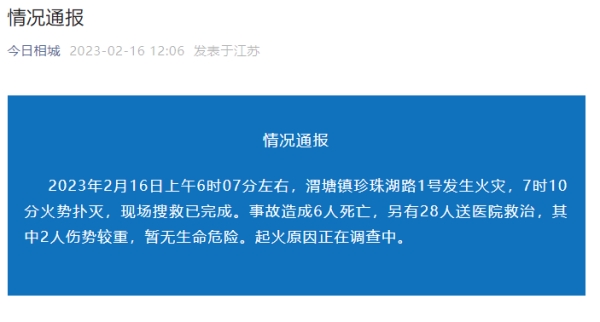 ????據今日相城微信公眾號消息:2023年2月16日上午6時07分左右,渭塘鎮珍珠湖路1號發生火災,7時10分火勢撲滅,現場搜救已完成。事故造成6人死亡,另有28人送醫院救治,其中2人傷勢較重,暫無生命危險。起火原因正在調查中。