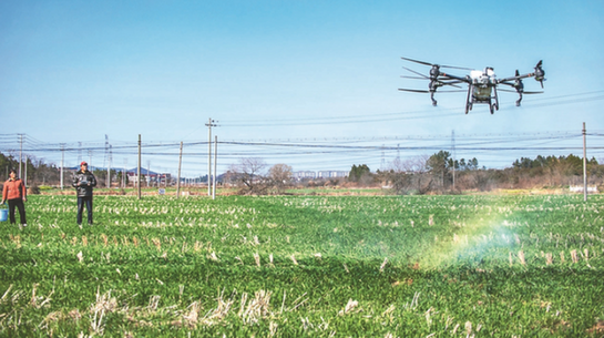 25日,南京市溧水區石湫街道光明村種糧大戶武孝慶使用高效植保無人機追施葉面肥。朱紅生 攝