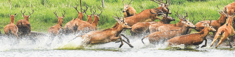 在江蘇大豐麋鹿國家級自然保護區,一群麋鹿渡過河流。新華社記者 李博 攝