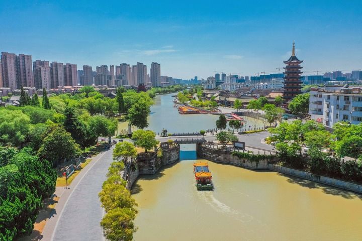在江蘇省淮安市清江浦區里運河,一艘游船駛過清江閘。新華社發(王昊攝)