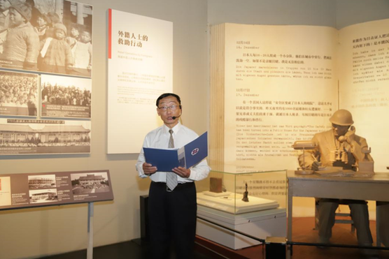 “我要目睹這些殘暴行徑,以便我將來能作為目擊證人把這些說出來……”紀念館展廳內,紫金草志愿者張繼軍和傅云生在拉貝塑像前朗誦《拉貝日記》選段,國際志愿者Mark和社會志愿者李國榮在魏特琳雕像前誦讀《魏特琳日記》選段,緬懷拉貝、魏特琳等國際友人為南京難民所做的貢獻,共同守望世界和平。