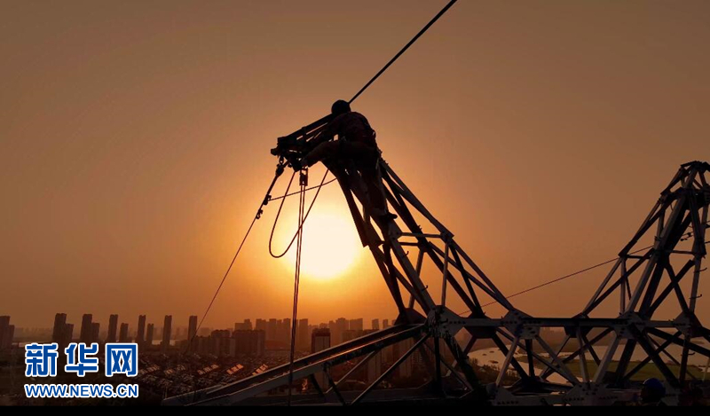 近日,在江蘇蘇州220千伏車寶線檢修現場,電力工人在高空更換輸電線路絕緣子。蘇州河畔,落日余暉映彩霞,高塔上的“繡花匠”們無暇顧及眼前的美景,默默守護身后的萬家燈火! (文靜 報道員:宋昱 楊小明)