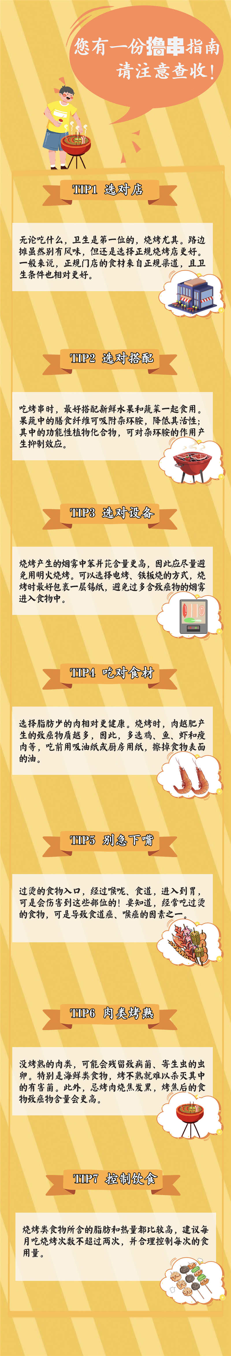 近日,全國掀起一波“燒烤熱”!那噼里啪啦的爐火,那滋滋冒油的肉串,那大快朵頤的愜意,是氤氳在燒烤里的人間煙火氣。燒烤后的食物色澤金黃、香氣四溢,誘人垂涎,卻也存在著潛在的健康風險。如何吃燒烤更健康?擼串前必看的“健康指南”請收好。(王玥)