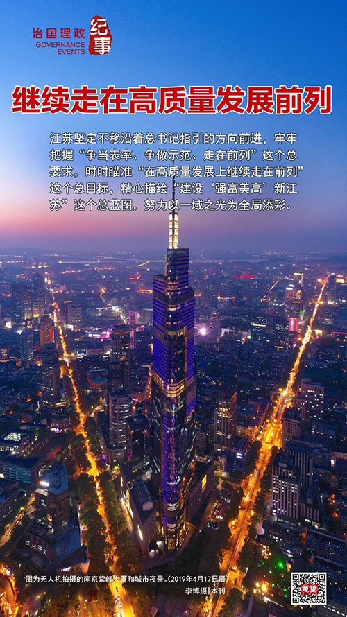 ??? 通計熟籌,蹇視高步。江蘇堅定不移沿著總書記指引的方向前進,牢牢把握“爭當表率、爭做示范、走在前列”這個總要求,時時瞄準“在高質量發展上繼續走在前列”這個總目標,精心描繪“建設‘強富美高’新江蘇”這個總藍圖,努力以一域之光為全局添彩。
