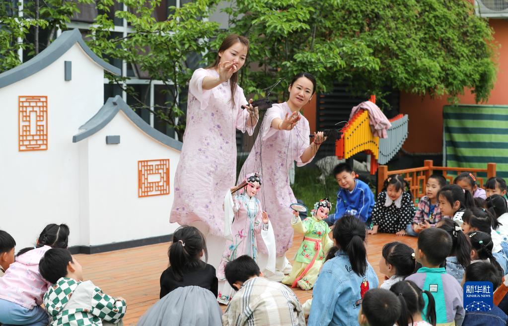 孫菁(右)、施錦芳在七都幼兒園為小朋友表演木偶昆曲(4月20日攝)。