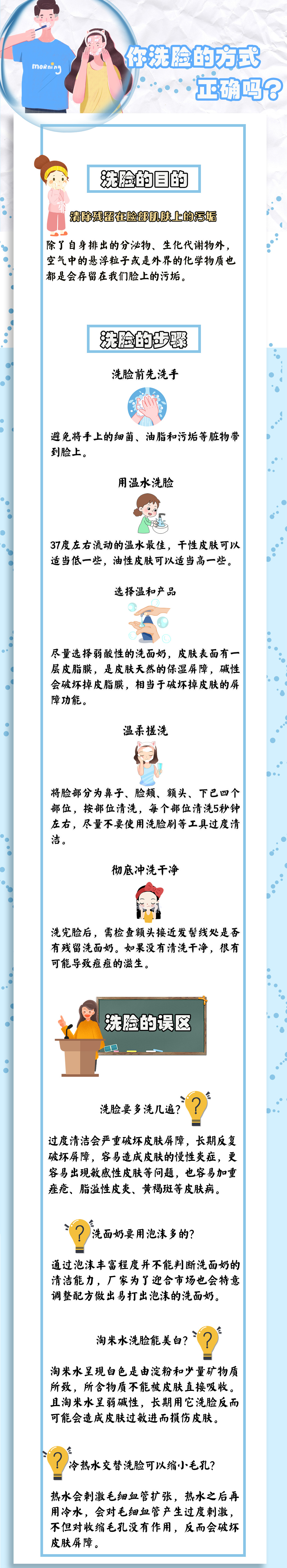 有些事每天都在做卻未必做得好,比如洗臉。潔面是日常生活中必不可少的一項基本護理。但是很多人在潔面時存在一些錯誤的觀念與方法,這些錯誤不但不能達到潔凈面部的效果,還可能傷到肌膚。戳圖看看,這么多年來你洗臉真的洗對了嗎?(王玥)