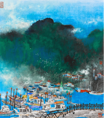 城市山水畫,是一個鮮活的新主題。城因山而生滿靈氣,人則是城市的唯一靈魂。我徜徉在玉明先生筆下的山與水之間,城市的高樓與云朵相依,樓宇就像詩行排列在晚歸的途中。甚至,我有瞬間想閉目冥想的遐思。他用藍色筆墨描繪的山水,似乎比水本身還要靈動,我看見的云朵如同蓮花盛開,從而逐漸蔓開成濃郁的氣象,我仿佛能聽見星空下大海涌來的聲音。于此岸與彼岸之間,萬里可以神通,陌生的一切,瞬間已變得不再有任何距離。
