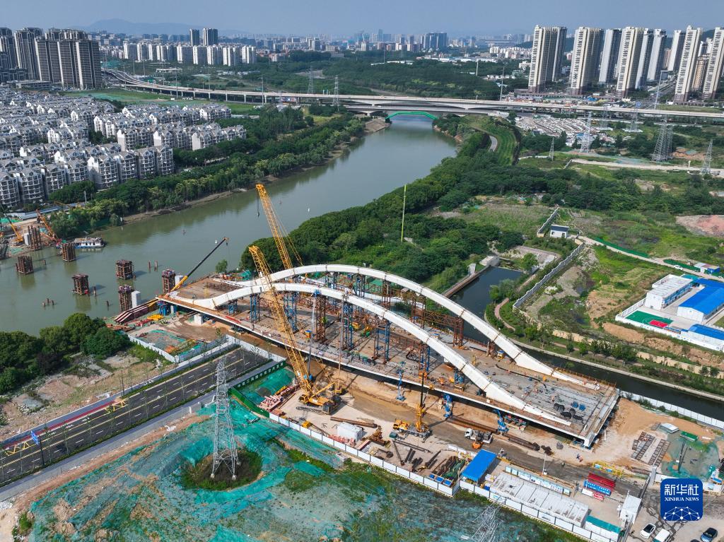這是6月2日拍攝的南京梅苑南路跨秦淮新河大橋施工現場(無人機照片)。新華社記者 李博 攝