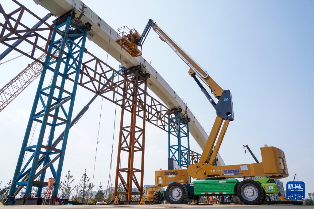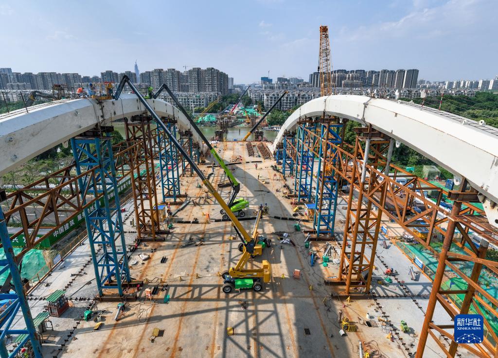 這是6月2日拍攝的南京梅苑南路跨秦淮新河大橋施工現場。新華社記者 李博 攝