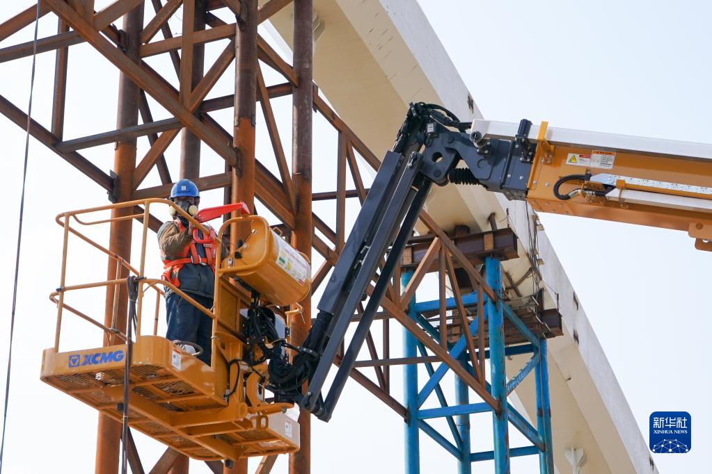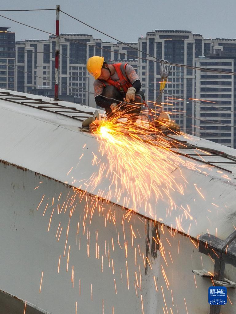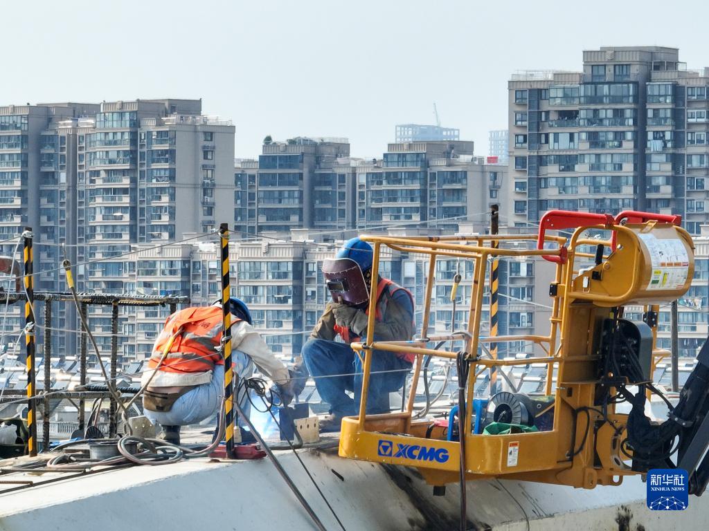 6月2日,中建三局的工程人員在南京梅苑南路跨秦淮新河大橋施工現場進行焊接作業(無人機照片)。新華社記者 李博 攝