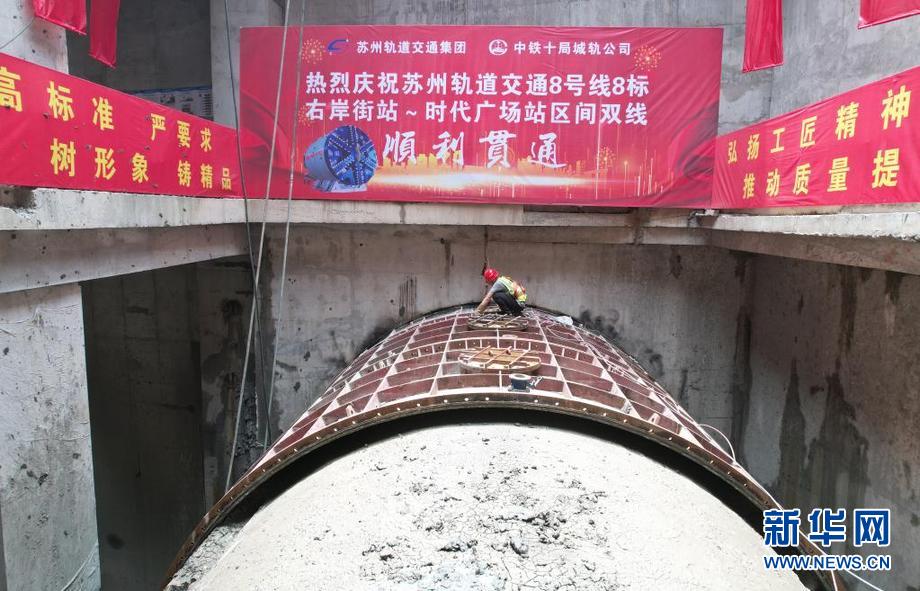 ????在江蘇蘇州軌道交通8號線時代廣場站鋼套筒接收處,施工人員在檢查鋼套筒。(6月7日攝,無人機照片,中鐵十局城軌公司供圖)