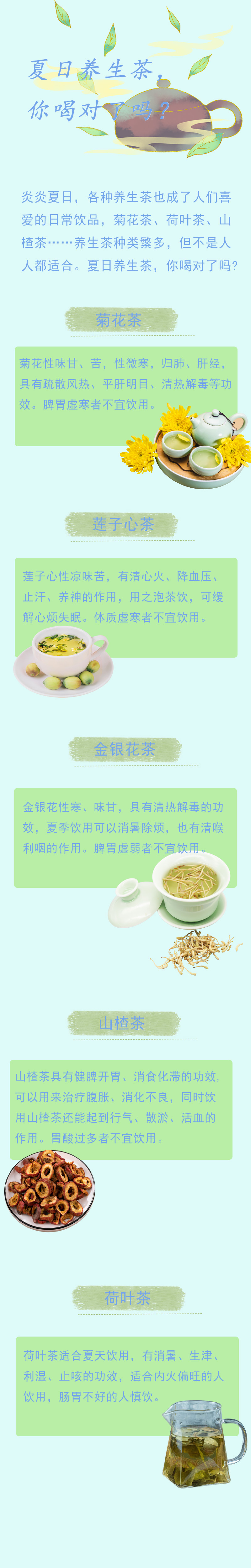 炎炎夏日,各種養生茶也成了人們喜愛的日常飲品,菊花茶、荷葉茶、山楂茶……養生茶種類繁多,但不是人人都適合。夏日養生茶,你喝對了嗎?(崔雯雯)