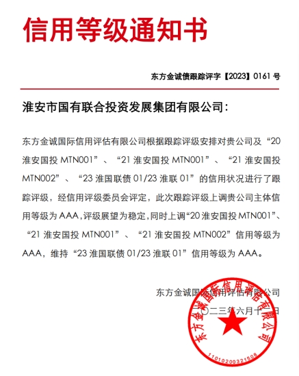 6月12日,經國內權威信用評級機構東方金誠國際信用評估有限公司評定,淮安市國有聯合投資發展集團有限公司主體信用等級由AA+調增至最高級別AAA,評級展望為穩定,為淮安市首家獲得國內主體最高信用評級的企業。