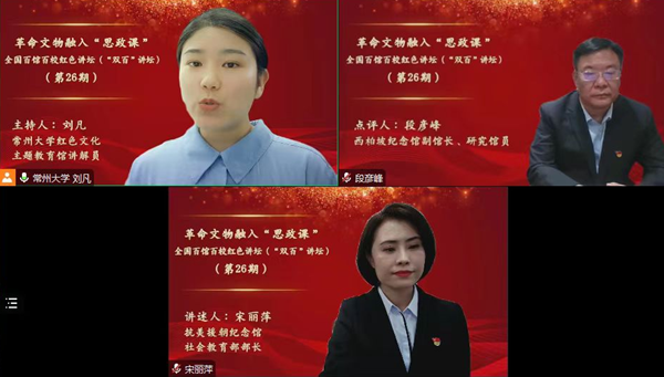 為推動用好用活革命文物工作,由全國館校合作聯盟主辦,中國文物交流中心指導,常州大學馬克思主義學院、常州大學近現代史與紅色文化研究院聯袂推出“革命文物融入‘思政課’全國百館百校紅色講壇”(簡稱“‘雙百’講壇”)第26期網絡課程活動,6月14日在網絡上成功舉辦。本期邀請抗美援朝紀念館社會教育部部長宋麗萍擔任講述人,西柏坡紀念館副館長段彥峰擔任點評人。來自全國館校合作聯盟理事單位的常州大學、抗美援朝紀念館、西柏坡紀念館等高校部分師生及博物館人,通過線上方式參加了此次活動。該活動由全國館校合作聯盟秘書長朱成山教授擔任總策劃和總撰稿。