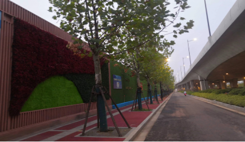 施工過程中,項目廣泛應用高桿噴淋設備,相較于傳統的降塵設備,高桿噴淋裝置覆蓋范圍更廣,降塵效率更高,有效規避了傳統圍擋噴淋水壓小,移動式霧炮受電源、水源等限制的問題。同時,依托智慧工地,通過揚塵在線監測系統,實時、遠程、自動監控鏡頭20米范圍內的顆粒物濃度,抓取數據?!艾F場還設置了車輛沖洗抓拍等系統,我們希望通過智能化的監管方式,降低在建工地的碳排放?!表椖考夹g員高凱介紹道。