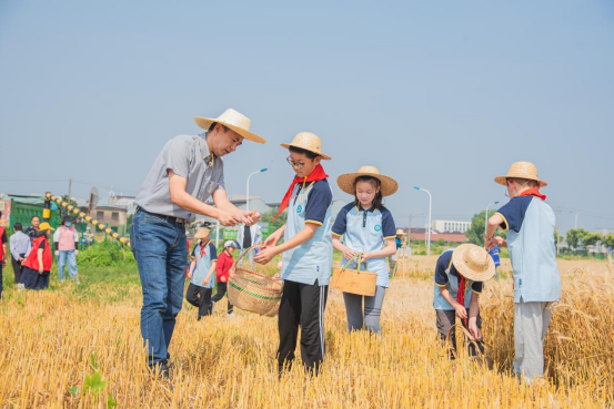 金黃燦亮的麥子在微風中輕輕搖曳著細長的腰桿,呈現出一派豐收在望的喜人情景,看著豐收景象,學生們也躍躍欲試,變身“小麥農”?!跋碌兜臅r候要有一定的角度,斜斜地向上割……”在經驗豐富的農民割麥示范后,同學們有的挽起袖子,拿起鐮刀,扶住麥稈,用力一割,一把麥子俯首而下;有的拿起籃子,戴上草帽,蹲下身子,眼睛仔細地搜尋,把遺漏在田里的麥穗撿起放入籃中;有的則輕輕捻開麥皮,好奇地舔舔里面的麥子,清香味沁入心田……大家忙得不亦樂乎,陽光下,風吹麥浪,汗珠閃亮,融入自然,體驗樂趣,紅撲撲的笑臉定格在此刻,好一幅熱鬧的勞動景象。