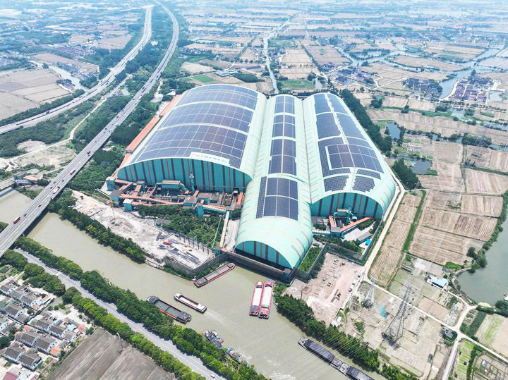 6月9日無人機拍攝的常熟市龍騰特種鋼有限公司碼頭料場屋頂光伏。