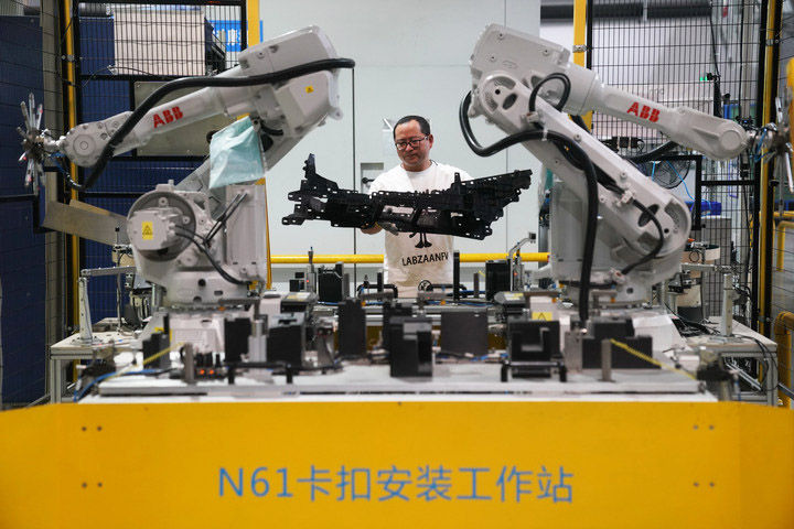 6月7日,在江蘇常熟汽飾集團生產車間,工人在卡扣自動化安裝工作站上料。