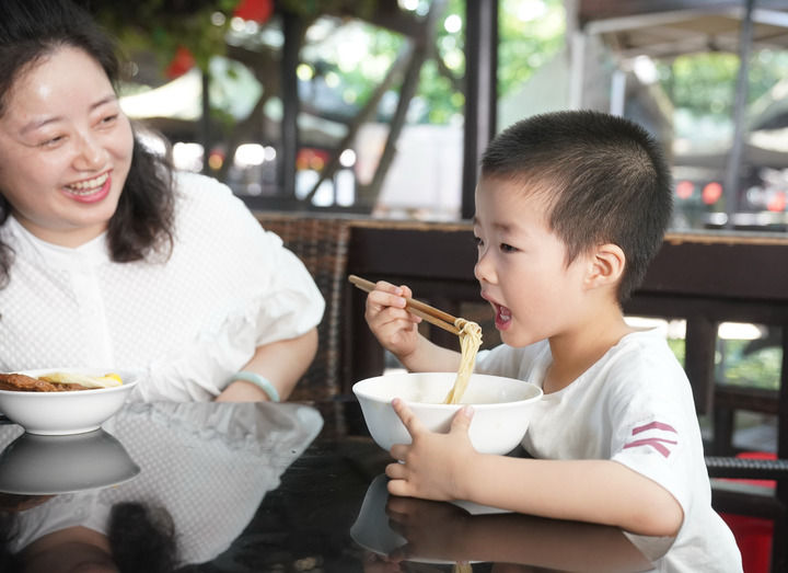 6月9日,小朋友在常熟市望岳樓老面館品嘗蕈油面。