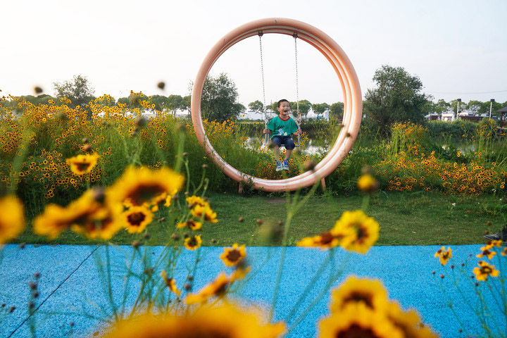 6月6日,小朋友在常熟市塢坵村蕩秋千。