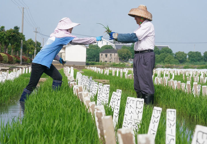 6月6日,常熟市農科所水稻育種專家端木銀熙(右)和技術人員一起在秧田拔除雜株,檢查秧苗生長情況。