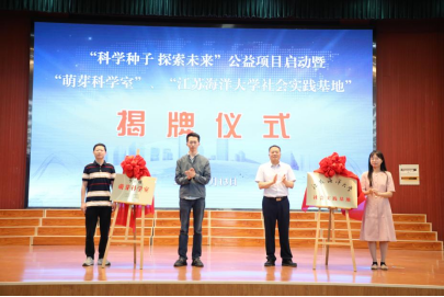 揭牌儀式上,連云港市科協、江蘇海洋大學、江蘇省婦女兒童福利基金會、江蘇省科普服務中心等參會嘉賓共同為“科學種子 探索未來”公益項目啟動暨“江蘇海洋大學社會實踐基地”和“萌芽科學室”揭牌。