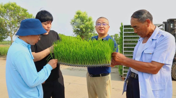 五烈現代農業產業園核心區稻田畫觀景塔下,一場教授與農場主的對話,把路過的老農也引下車去駐足聆聽。在一臺缽苗擺載插秧機前,幾個人捧著一缽綠油油的秧苗,站在中間的南京農業大學教授王強盛輕輕地撥弄著說:“缽苗擺栽最大的好處是沒有緩苗期,栽到田里馬上就能分莖合棵,常規的機插秧大概要7到10天的緩苗期?!弊髠鹊奈辶椰F代農業園負責人蔣維銀馬上接過話茬說:“多出了一個星期,水稻在田間的有效生長期就能增加到175天。這為水稻的優質高產奠定了基礎?!币晃晦r民大爺點著頭說:“這技術好,我們也要學?!?/p>