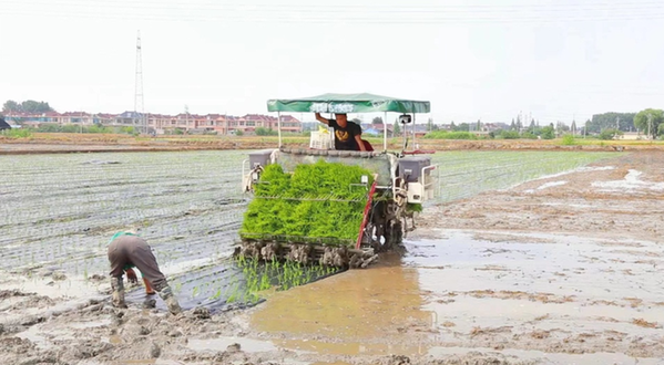 一臺臺插秧機在寬廣的田野里播綠成片。該公司糧食種植示范基地的田埂旁、水溝邊,包著一層厚厚的塑料膜,防控雜草生長;防滲渠放水口,纏著飄逸的絲網,擋住草種隨水流入田間;中間的一塊水田里,插秧機先鋪下黑色薄膜,再把秧苗栽插進薄膜間的小孔內,這里采用的是全生物降解膜替代技術?!拔覀冞@塊田,今年一兩除草劑都不打?!?惜禾農業技術負責人吳繼維自豪地說。