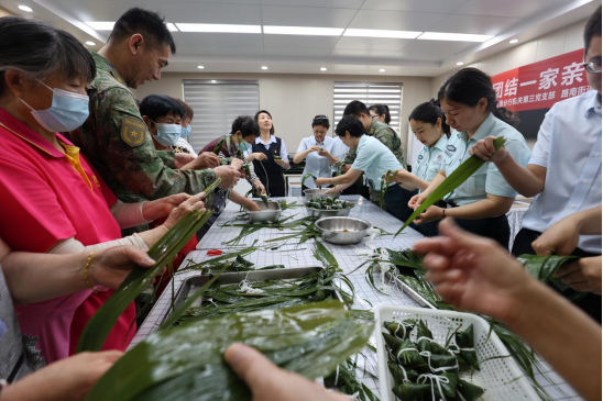 ????當天上午,“軍民團結一家親,濃情端午心連心”包粽子活動在連云港干休所生活服務中心展開,社區熱心居民、南京銀行工作人員和干休所官兵、文職人員們齊聚一堂,一邊聊家常,一邊包粽子。在大家共同努力之下,不一會,粽子就裝滿盆了。據了解,社區居民來干休所包粽子已經有將近十年了,她們每次都滿懷熱忱,希望讓干休所的官兵們吃到家的味道。