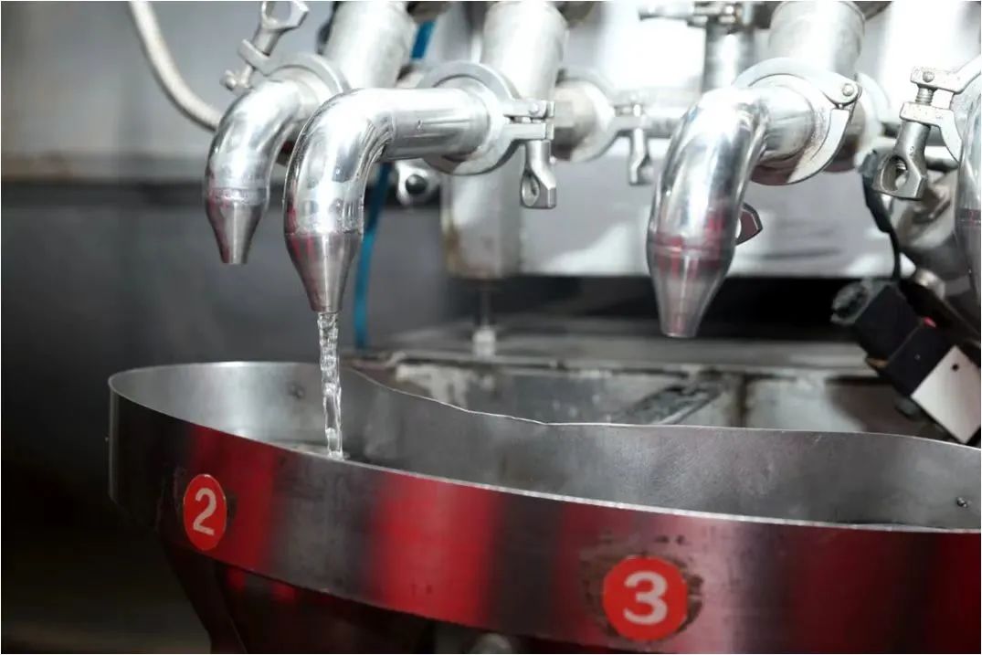 智能裝甑完畢后,就開始了分段摘酒?!俺鼍评?!出酒啦!”隨著一聲吆喝,秋天的第一縷原酒從接酒口緩緩流出。