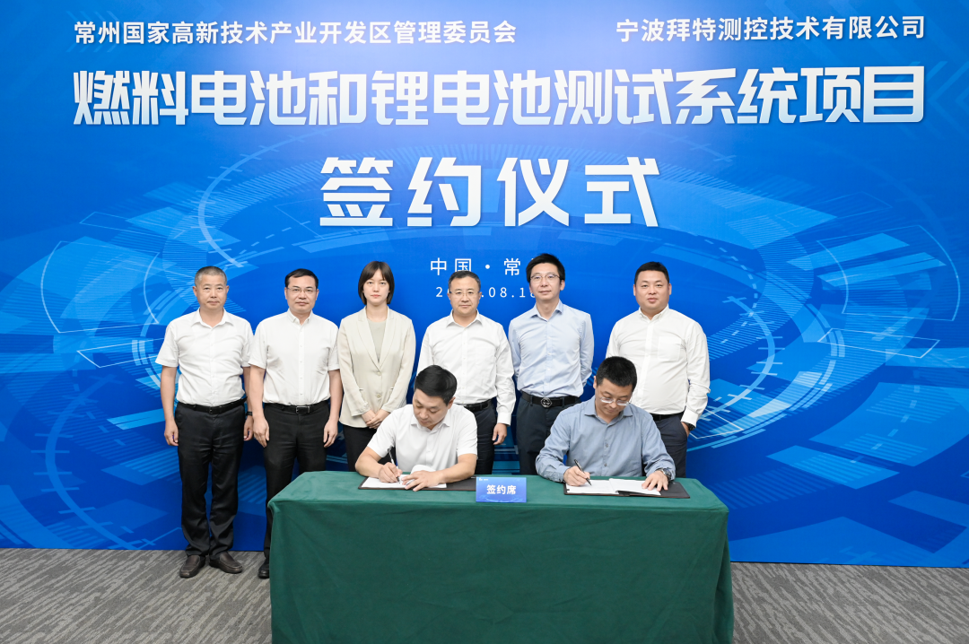 2023年8月18日,總投資5億元的燃料電池和鋰電池測試系統項目落戶常州國家高新區。區黨工委(區委)副書記、區長石旭涌會見寧波拜特測控技術有限公司董事長斯國東一行并出席簽約儀式。