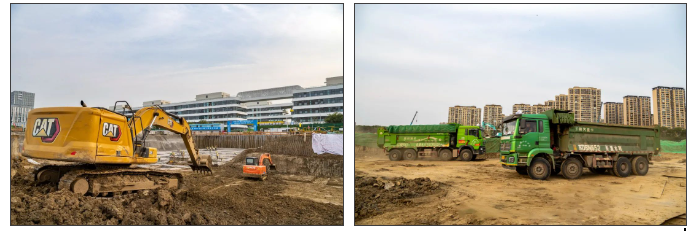 在項目施工現場,10余臺挖掘機每天持續轟鳴著,揮舞長臂來回作業,60余名建設工人各司其職,揮灑汗水抓緊施工,另外還有50余土方車輛穿梭其間,“滿弓”作業,確保項目所需土方的順利運輸。