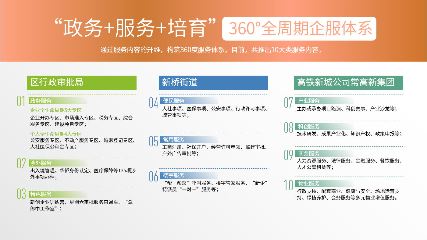 常州高鐵新城充分依托高新區行政審批局、新橋街道便民服務中心政務資源、高鐵新城公司和常高新集團平臺服務資源與社會專業機構服務資源,聚焦招商引資企業、重點關注企業、已入駐優質企業等,建立“政務+服務+培育”的360度服務體系,助力營造一流政務環境、產業環境、營商環境,為打通服務企業的“最后一米”,助力產業高質量發展培育新動能。