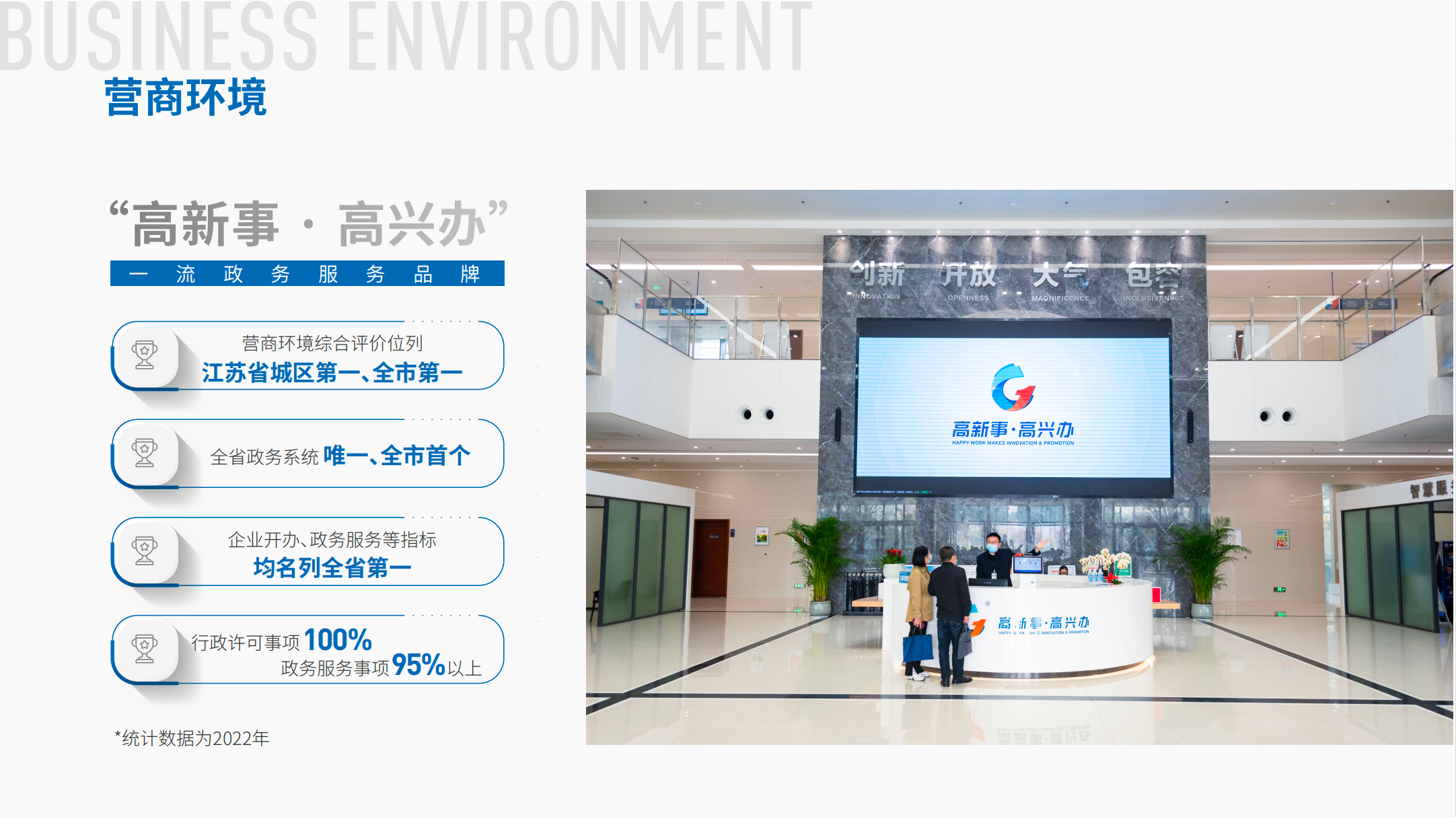 常州國家高新區秉承“創新、開放、大氣、包容”精神,緊緊圍繞扮靚“六張高新名片”,匠心打造“高新事·高興辦”一流政務服務品牌。營商環境綜合評價位列江蘇省城區第一、全市第一;全省政務系統唯一、全市首個;企業開辦、政務服務等指標均名列全省第一等榮譽。未來高新區將繼續貫徹店小二精神,全力打造“運營成本最低、辦事效率最高、貿易投資最便利、發展預期最穩定”的一流營商環境。