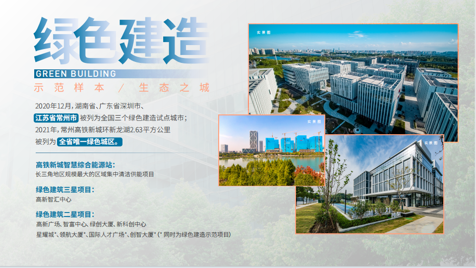 2020年12月,湖南省、廣東省深圳市、江蘇省常州市被列為全國三個綠色建造試點城市,常州高鐵新城作為常州市的綠色建造示范區,先后接待各級領導觀摩調研,2021年,常州高鐵新城環新龍湖2.63平方公里被列為全省唯一綠色城區。常州在2022年度全省綠色建筑工作考核評級中獲評A等級,其中常州高鐵新城綠色宜居城區以全省最高分順利通過省住建廳驗收評估。常州高鐵新城獲評住建部“2023年中國人居環境獎”。