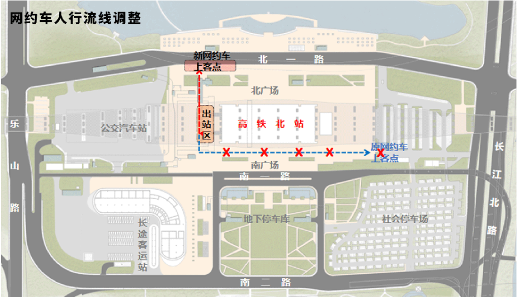此前,由于網約車接送點距離進出站口較遠,給來往旅客的換乘帶來了諸多不便。同時網約車與私家車動線的重疊,以及個別車輛慢行、違停、占道,導致場站車流擁堵情況也時有發生。經多方研究并現場踏勘后,決定在常州北站北側設立新的網約車上客點。