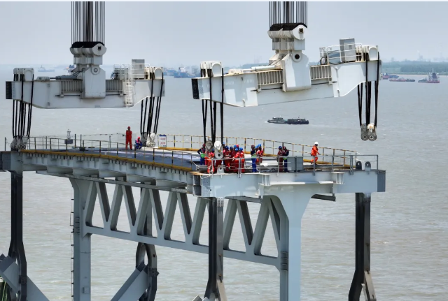 此次吊裝的合龍段鋼桁梁長14米,寬35米,重約800噸。合龍段吊裝完成后,將按照先邊跨后中跨的順序進行合龍施工,即先與泰興側邊跨合龍后,通過縱向頂推、橫向對拉、斜拉索索力調整等措施,將合龍口兩側鋼桁梁的縱向、橫向、豎向距離調整到毫米級精度。隨后還將開展高強螺栓施擰、鋼桁梁焊接和最后一組斜拉索安裝等一系列作業,實現最終合龍。