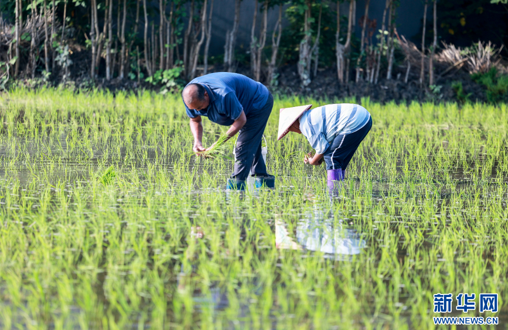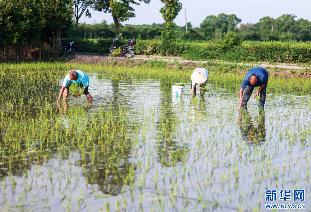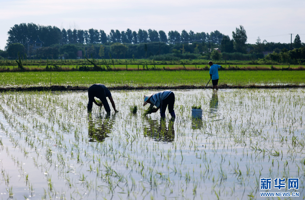 泰興市古溪鎮顧莊村顧南三組村民在水稻田間補栽秧苗