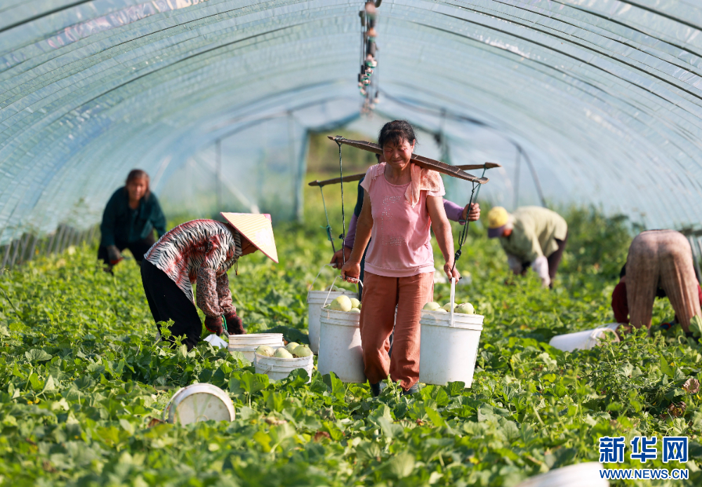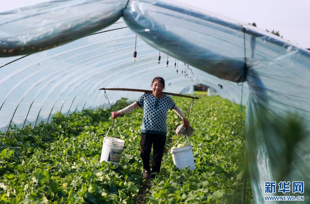 泰興市古溪鎮顧莊村松楊四組村民在大棚內將采摘的甜瓜挑運到田邊