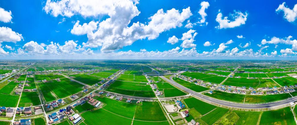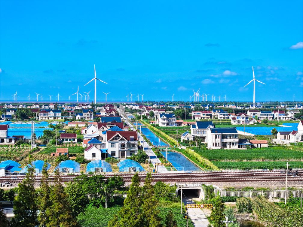 初秋時節,江蘇省如東縣境內的田野、道路與民居交相輝映,藍天白云下,遠處的風車緩緩轉動,宛如一幅絢麗多彩的畫卷。