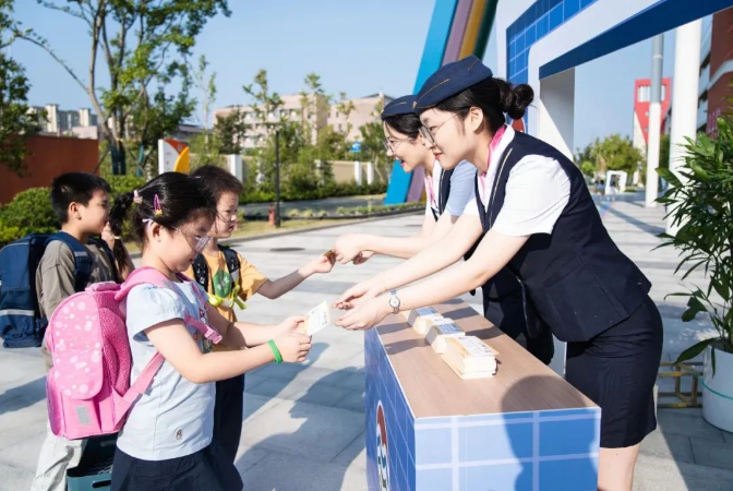 煥然一新的校園里,孩子們在帥氣“機長”和美麗“乘務員”老師的熱情迎接下,接過“機票”。