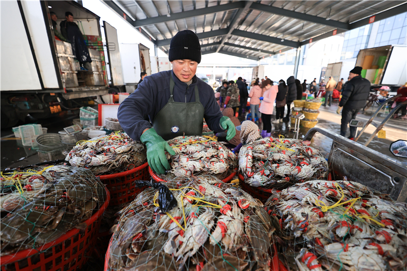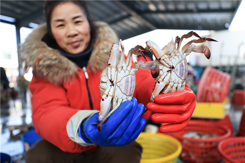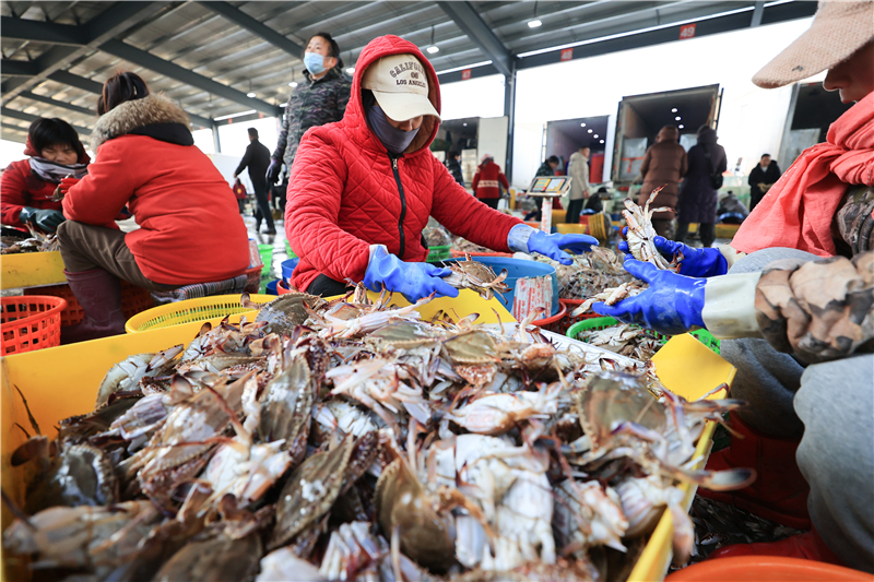 新年伊始,沿海冬捕梭子蟹喜獲豐收。連云港市贛榆區海頭鎮海產品交易市場,漁民在分揀捕獲的鮮活梭子蟹。 當地漁業碼頭每天捕獲上岸的梭子蟹約20萬公斤,漁民將鮮活梭子蟹分揀裝筐,除滿足本地市場供應外,大部分銷往北京、上海、廣州等地。(王玥 司偉 徐靜)