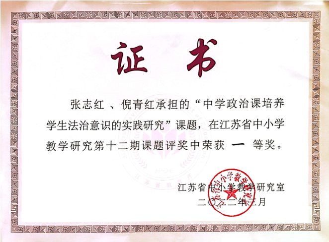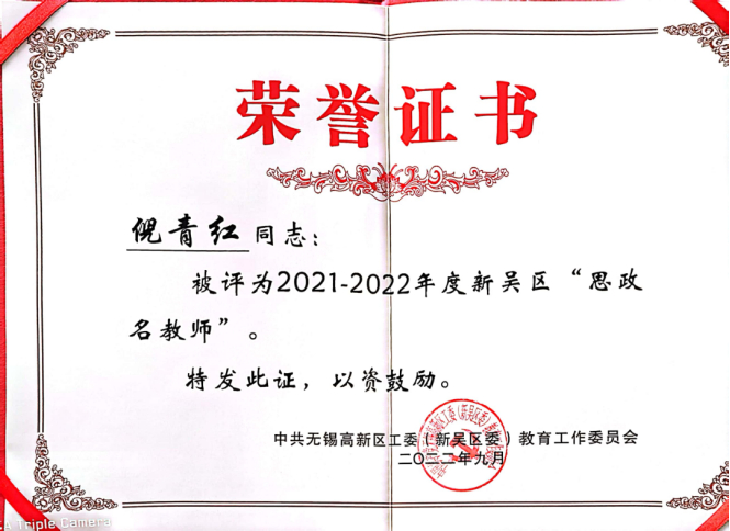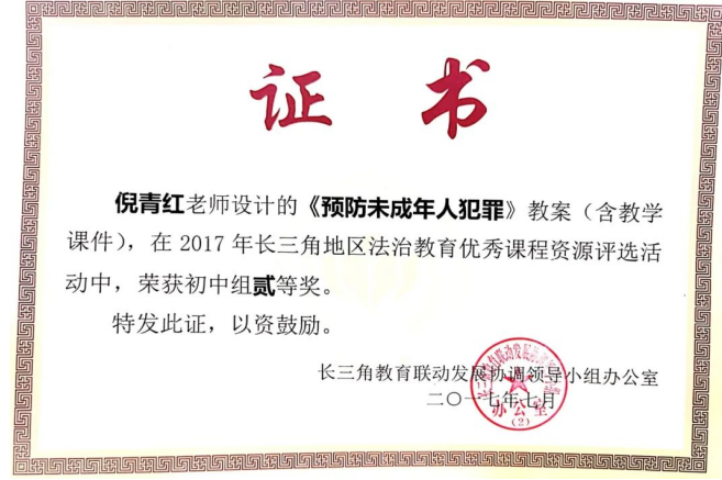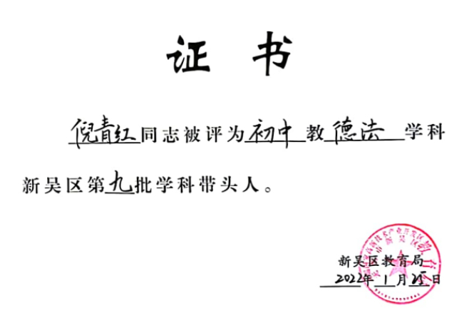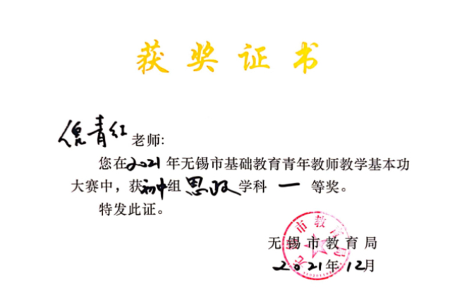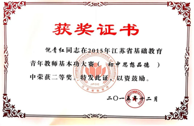 一路走來,倪青紅以踏實的工作作風、豐富的教學經驗,在教學上碩果滿滿:曾獲2015年江蘇省青年教師初中道德與法治基本功大賽二等獎,2017年長三角地區法治教育優秀課程資源初中組二等獎,2020年參加無錫市新吳區名師赴青海省互助縣教學交流,2021年無錫市青年教師初中道德與法治基本功大賽一等獎,2021年江蘇省“藍天杯”優秀教學設計一等獎,2023年無錫市大中小學思政一體化建設“金課”等;面向市、區、校,多次開設公開展示課、講座。