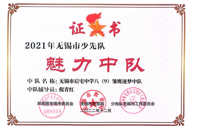 作為中隊輔導員,倪青紅始終秉持“愛學生如愛子女”的教育觀,時刻將學生放在心間。為促進學生的全面發展,她鼓勵學生積極參加各級各類藝體活動,既展示才華又增強膽識;為強化學生的法治意識,她主動指導學生參與“學憲法講憲法”的知識競賽,并獲得無錫市教育局頒發的優秀指導教師稱號;為增強學生的責任意識,她帶領學生一起進行社會小調查,為科學規劃獻計獻策,并獲得無錫團市委、教育局頒發的科學建議二等獎。她將點滴之愛匯聚成光,照亮了學生前行之路。在她的引領下,班級管理細致而有溫度,卓有成效:不少學生獲得“紅領巾星章”,成為學校五會少年,無錫市好少年等;所帶中隊榮獲得無錫市“魅力中隊”稱號,并多次獲得?!皟炐惆嗉w”榮譽。