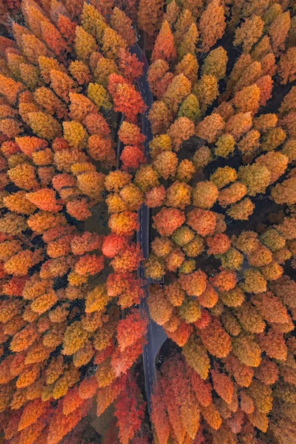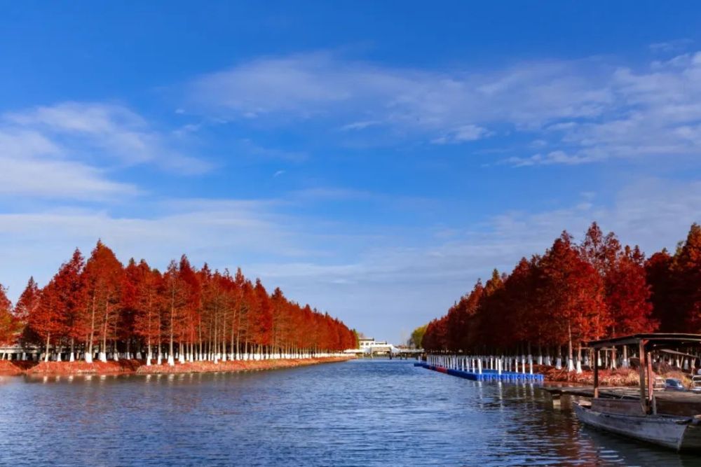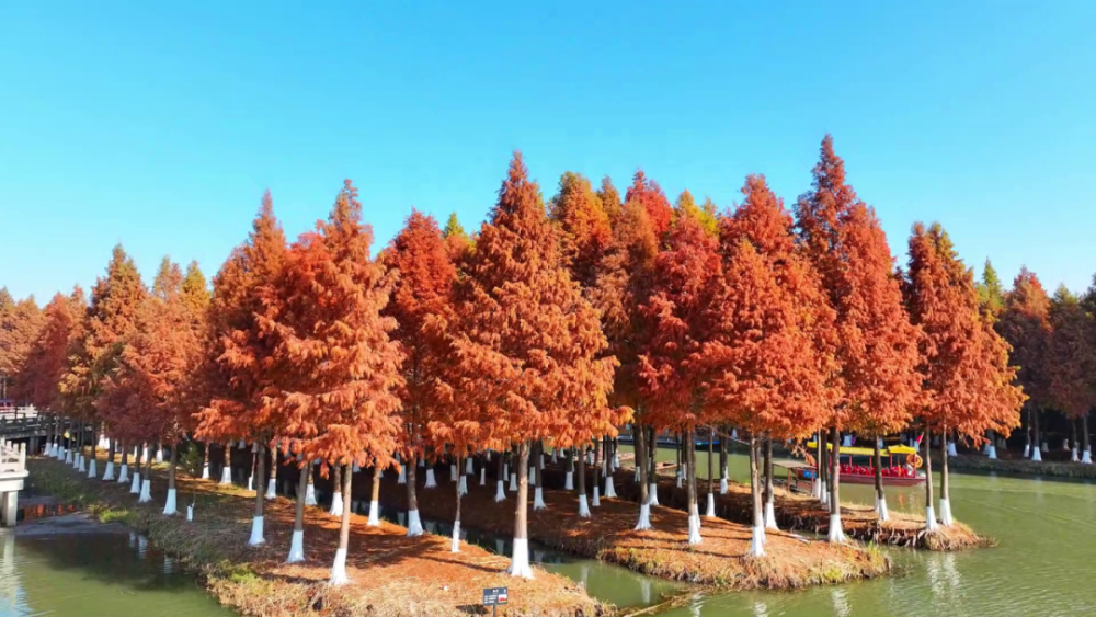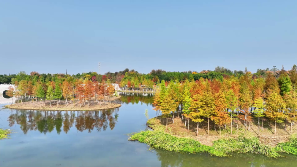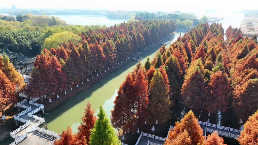 一排排挺拔的水杉高聳入云,墨綠、棕黃、深紅……多種色彩交織在一起,勾勒出絢麗多彩的生態畫卷。